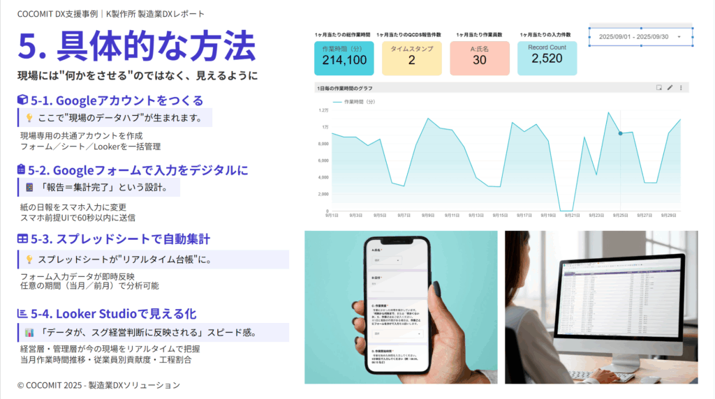 こうした「集計・共有・効率・データ活用」の課題に対して、現場と経営をデータで直接つなぐアプローチを中心に据え、最小限の負担で最大のリアルタイム可視化を実現しました。