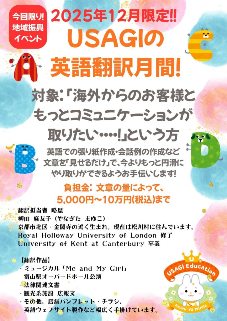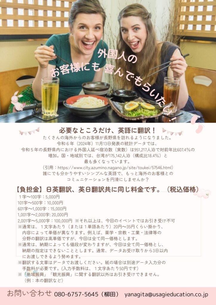 会員事業所の(株)USAGI Educationより英語翻訳のお知らせです。