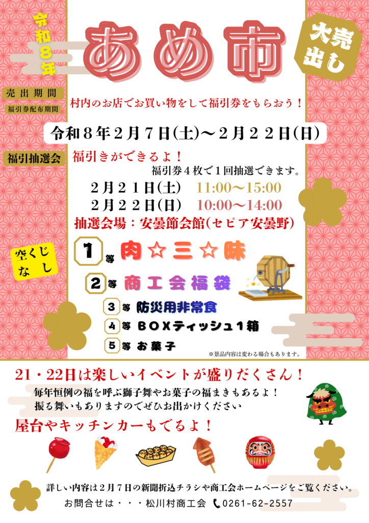 今年も毎年恒例のあめ市大売出しを開催いたします。売出期間(福引券配布期間)は2月7日(土)~22日(日)までとなります。福引抽選会は2月21日(土)、22日(日)に行います。抽選会に合わせて様々なイベントも予定しております。詳しくは2月7日の新聞折込チラシをご覧ください。