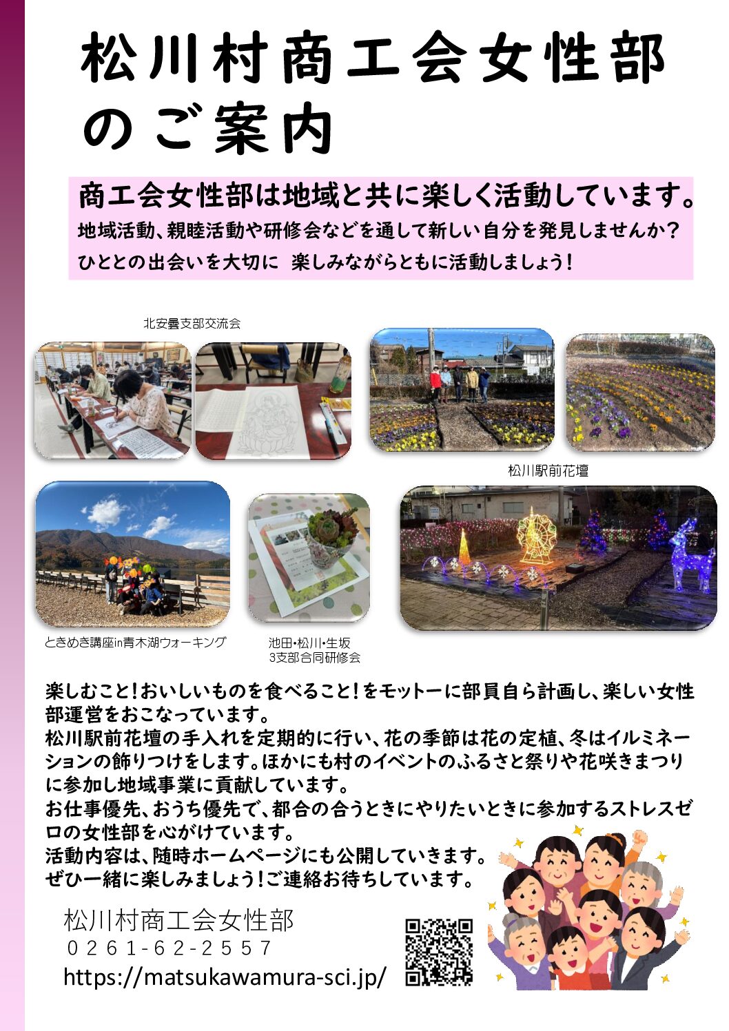 女性部への加入資格は、商工会会員事業主およびその事業に従事する親族となっております。現在部員数は40名で活動しています。活動内容は各種セミナー、地域活動(花咲き祭り、ふるさと祭り、駅前花壇づくり)、お楽しみ会などがあります。活動を通して親睦を深めアットホームな雰囲気で和気あいあいとしています。