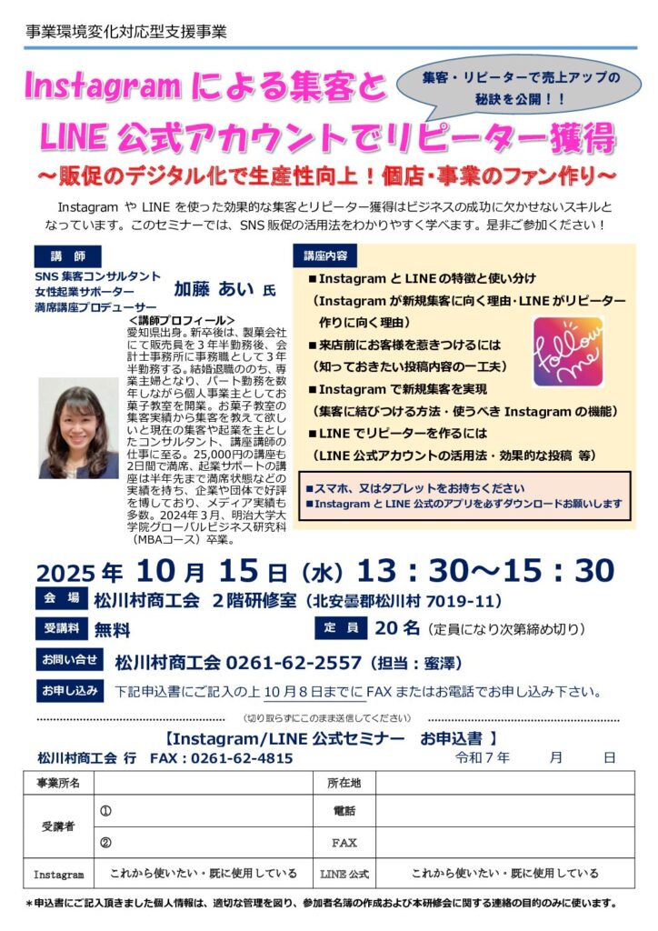 なお、事前にスマートフォンにInstagramアプリをダウンロード、LINE公式はアカウントを新規取得した状態にしてお越しください。ダウンロードやアカウントの取得がわからない場合は商工会までお問い合わせください。